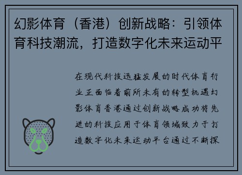 在现代科技迅猛发展的时代,体育行业正面临着前所未有的转型机遇。幻影体育(香港)通过创新战略,成功将先进的科技应用于体育领域,致力于打造数字化未来运动平台。通过不断探索与突破,幻影体育不仅提升了传统体育的观赏性和参与度,还将智能科技与体育赛事的融合推向了新高度。本文将从四个方面详细阐述幻影体育的创新战略及其在推动体育科技潮流方面的贡献,分别是:数字化转型与平台建设、智能技术在体育中的应用、体育赛事的科技化体验、以及面向未来的运动创新蓝图。在探讨这些方面时,我们将深入分析幻影体育如何利用创新技术打破行业边界,推动体育行业进入一个更加数字化、智能化的新时代。